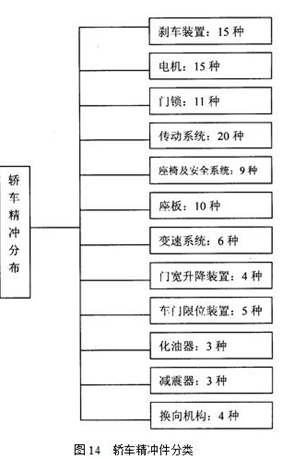 精沖工藝技術的發(fā)展,使其進入了各個工業(yè)領域,得到廣泛的應用。對于要求最小尺寸公差、具有最小粗糙度的功能零件,可以廣泛使用精沖零件。而對于有視覺要求的、很精細的表面零件,也可使用精沖零件。現今,精沖件的生產品種、尺寸形狀、材料厚度和力學性能都有很大的提高。而且為了適應市場需求,生產的均衡性、質量可靠性和加工經濟性更加突出。汽車工業(yè)是精沖技術推廣應用的重中之重,一輛轎車精沖零件擁有量為40~200件,它占轎車沖壓件的60~70%,如下圖所示: