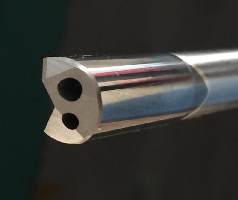 針對(duì)以上加工特性,現(xiàn)在市場(chǎng)上小直徑的槍鉆采用整體鎢鋼刀柄,大大提高了刀具的剛性,對(duì)于抗粘附性則采用切削合金部分涂層處理,通過(guò)涂層,大大提高刀具的耐磨性,抗粘附性。